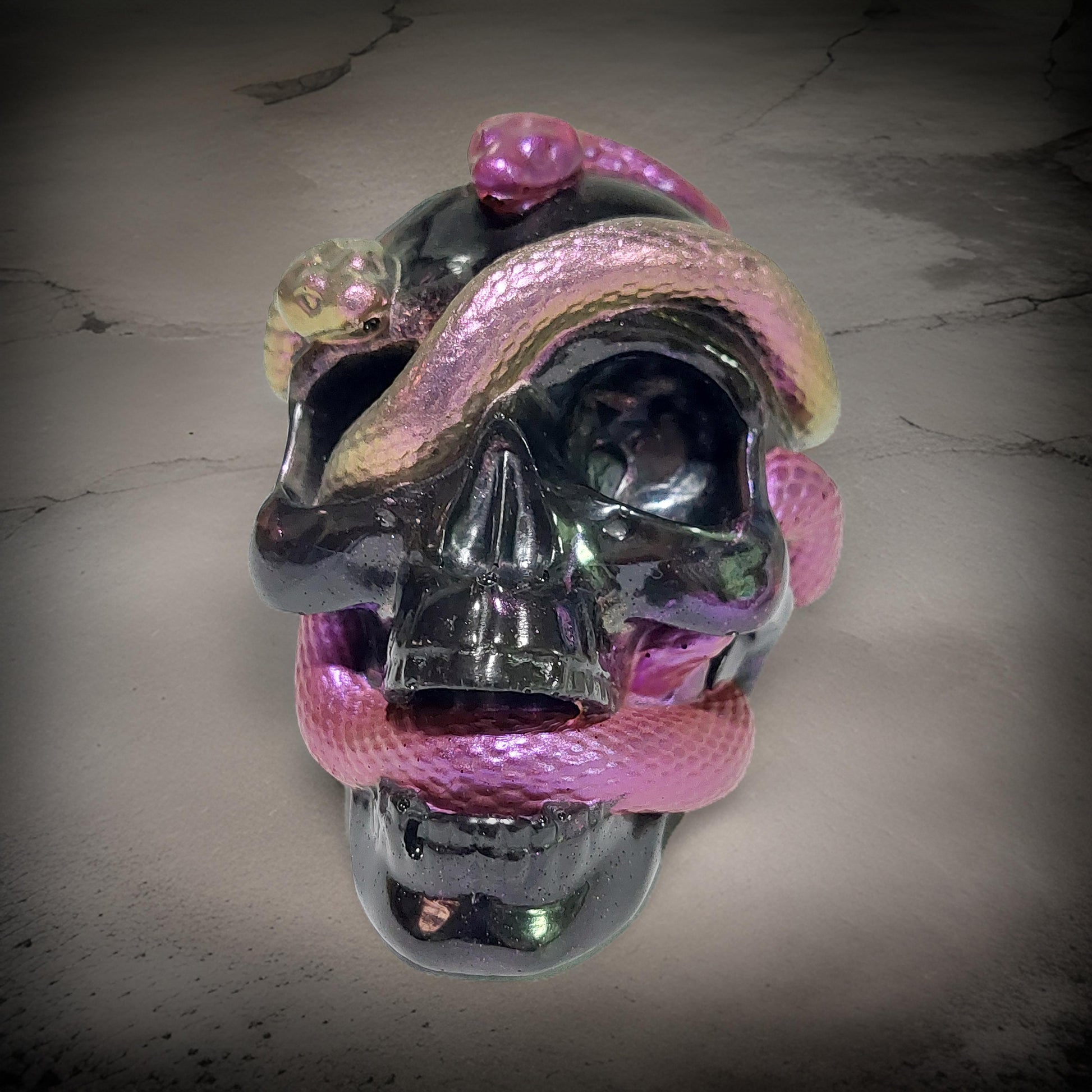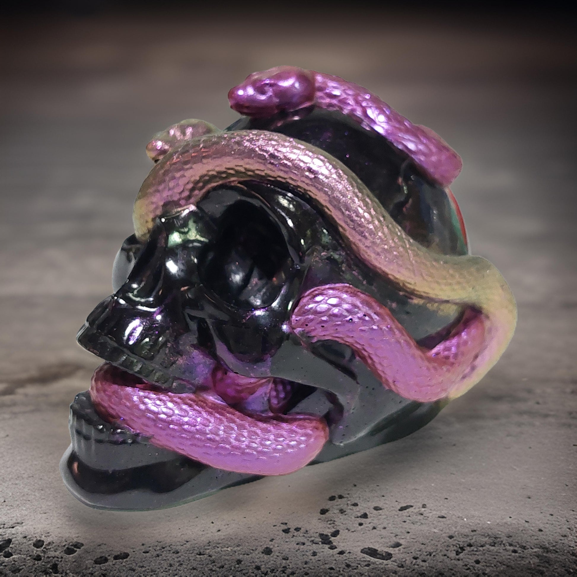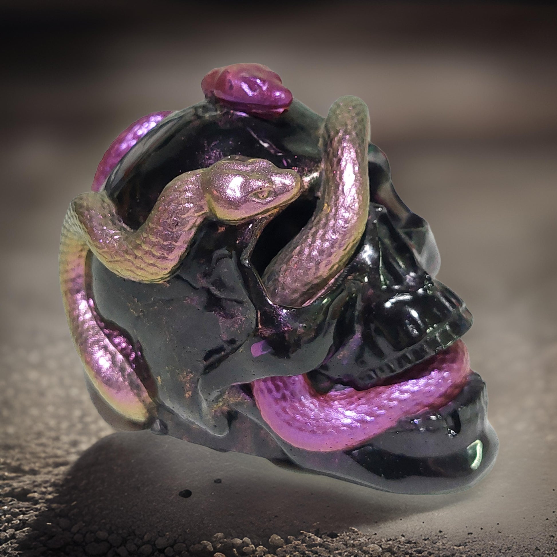 Standard size Snake Skull featuring gloss black skull face with Chameleon Galaxy and Violet colored snakes. An excellent choice when adding to your current collection. If you should have a specific color request, please contact us before ordering. Available in Extra Large upon request.