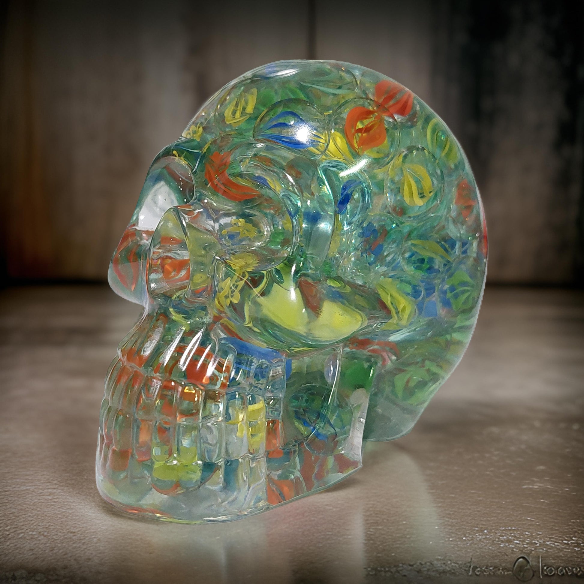The Resin Skull with Marbles is a striking piece that blends bold design with vibrant colors. Made from durable resin and accented with colorful marbles, it adds a unique and eye-catching touch to any space. Perfect for those who want to make a statement, this skull combines artistic flair with lasting quality to elevate your decor. Also available with built-in lights for an amazing effect. Available in standard size and Extra Large.