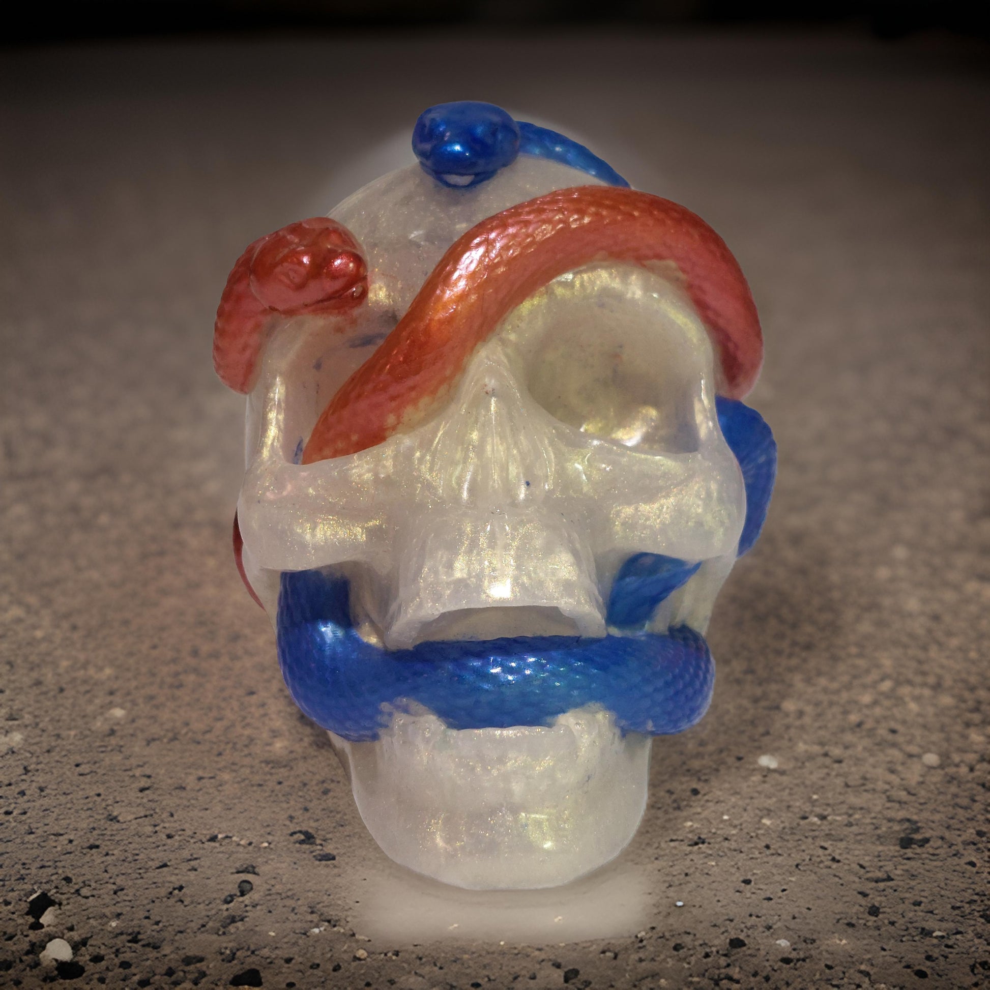 Make a bold statement with the Mirage White Skull featuring vivid red and blue snakes. Its standard size ensures it fits perfectly wherever you choose to display it, adding a striking and unique touch to your collection. This eye-catching design is sure to draw attention and showcase your distinctive style. Don’t miss out on owning this captivating piece.